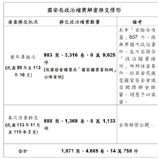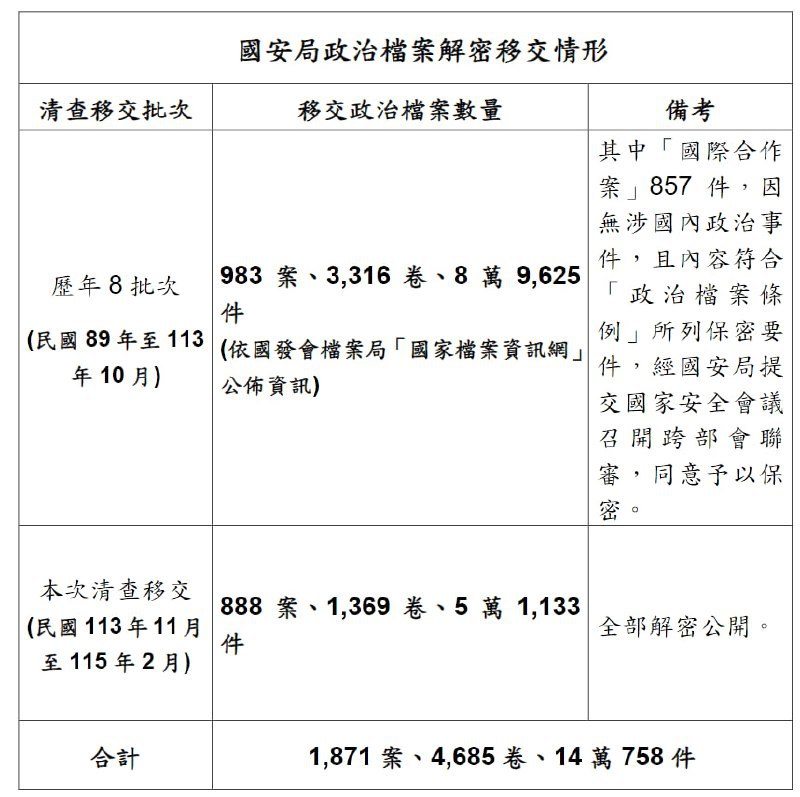 2024年11月起,该局清查了1992年以前所有23757卷、566415件档案,目录送档案局。档案局2025年6月审定其中1369卷、51133件为需公开的政治档案,国安局予以全部解密并扫描移交,内容有戒严时期保防安全工作制度、情报机关侦保防业务资料、反动文化出版品与黑函调查、国民入出境管制“黑名单”、海外台独团体活动、叛乱案件人员资料与判决书等。